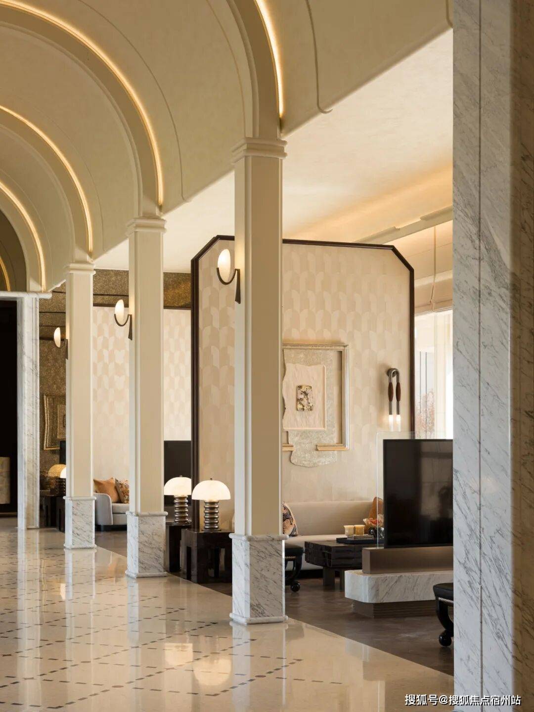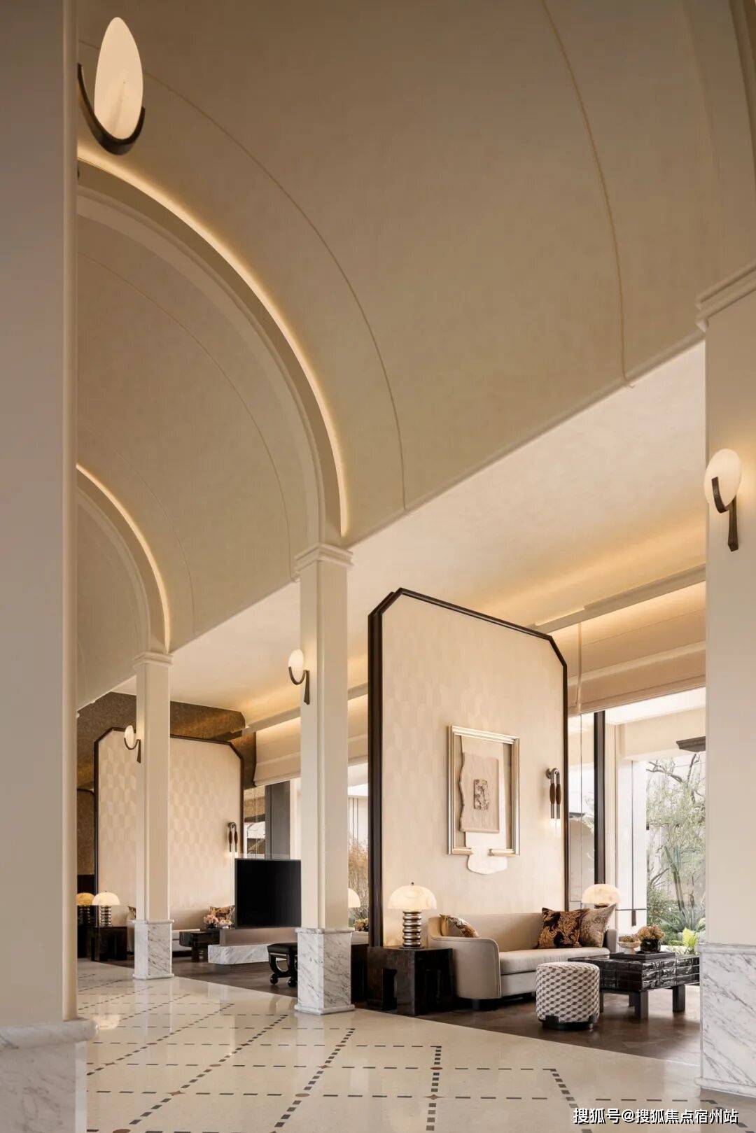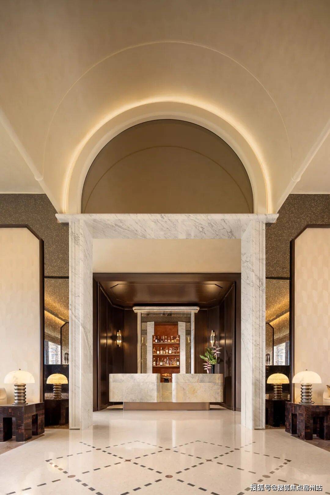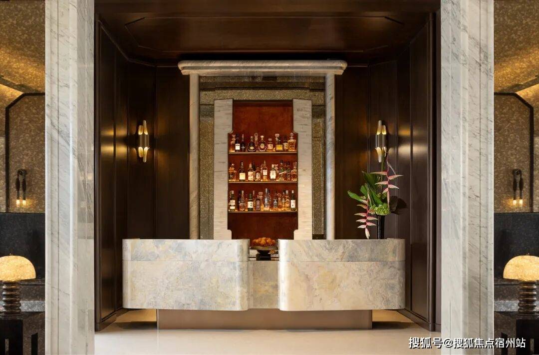深色酒液正在水晶杯中漾起琥珀光晕,窗边的哑金色锤纹矮桌其崎岖的肌理取建建的体块、拱门及立柱构成微妙呼应,