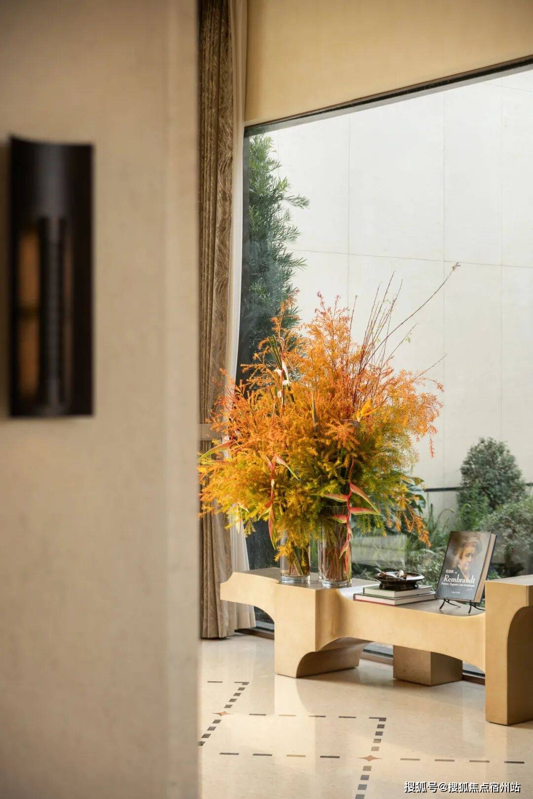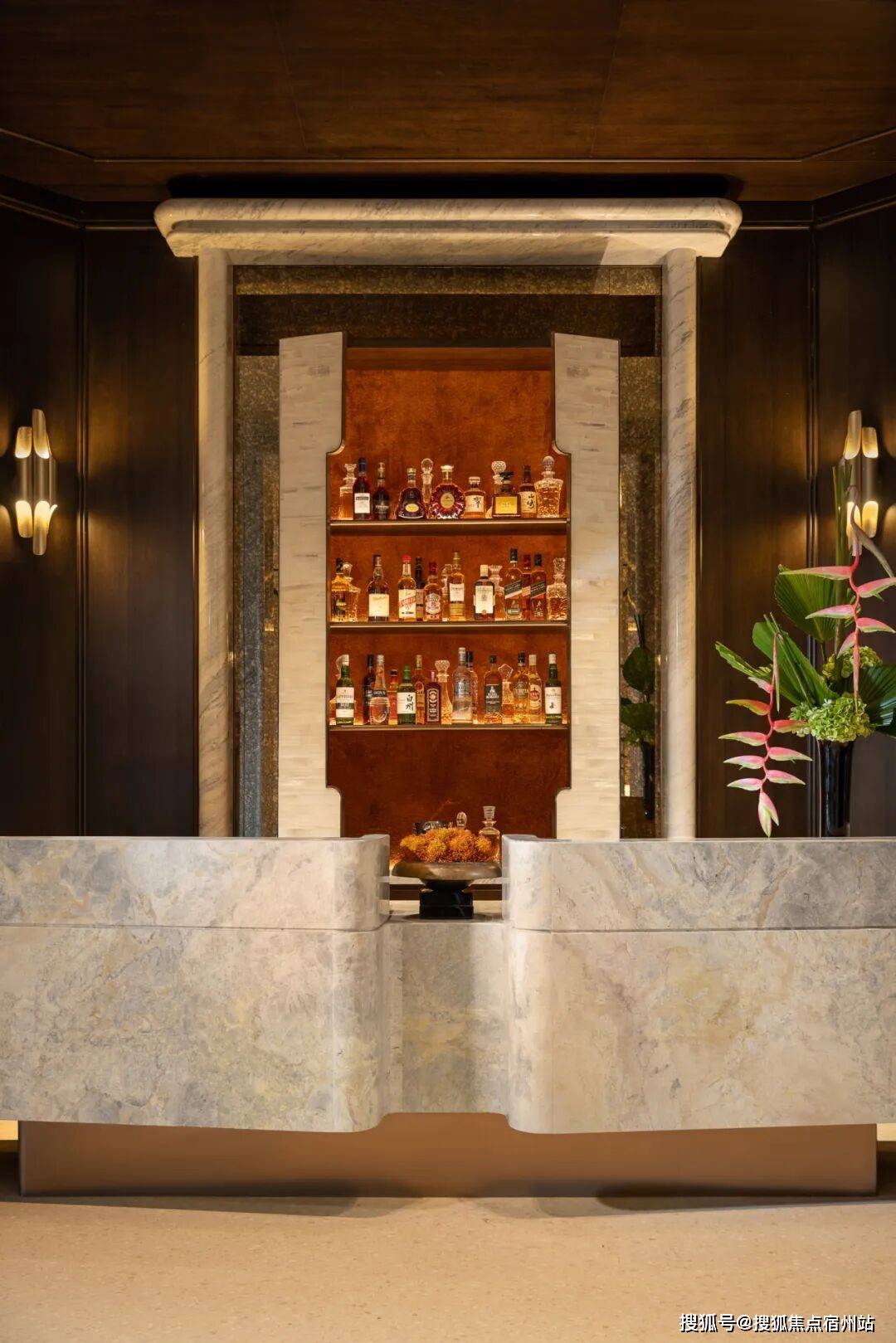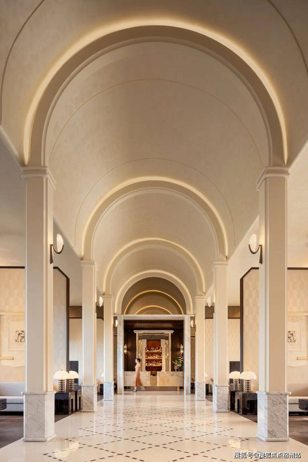 深色酒液正在水晶杯中漾起琥珀光晕,窗边的哑金色锤纹矮桌其崎岖的肌理取建建的体块、拱门及立柱构成微妙呼应,