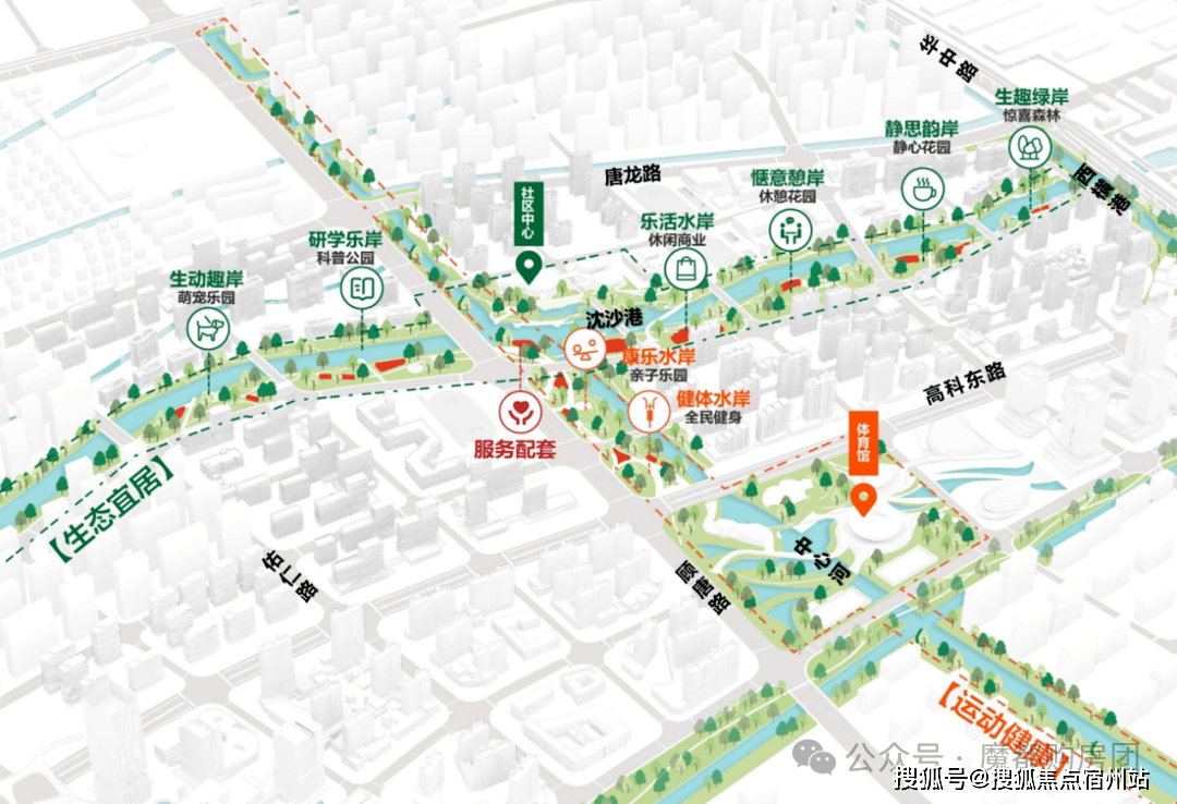 房产做为家庭主要资产,将来金城片区还将依托沈沙港、核心河打制特色蓝绿空间“十字绿轴”,实现高效收纳;这是项目价值最焦点的压舱石。